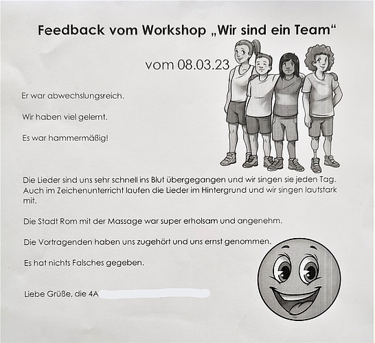 Vielen Dank für die Unterlagen. Die Klassenlehrer kümmern sich ums Feedback. Bekommst du dann. Es war eine gute Veranstaltung. Den Teamsong haben wir noch verschriftlicht und als Klassenlied etabliert.