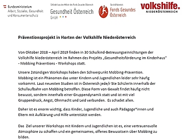 In 30 Horten der Volkshilfe Niederösterreich arbeiten wir im Schuljahr 2018/19 zum Thema Mobbing - Prävention und freuen uns bereits auf diese tolle Aufgabe.