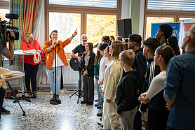 Wir freuen uns, dass wir als einer der Anbieterorganisationen vor den Vorhang geholt wurden und über die zahlreiche Berichterstattung aus der Musikmittelschule Wendstattgasse, 1100 Wien. (Bild links: Viktor Bauernfeind singt gemeinsam mit Schüler:innen und der Sängerin Virginia Ernst, Bild rechts: Vizebürgermeisterin Kathrin Gaal, Ilka Wiegrefe, Viktor Bauernfeind und Stadtrat für Jugend und Bildung Christoph Wiederkehr)