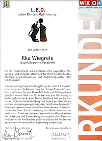 Am Donnerstag hat Ilka Wiegrefe den L.E.O.- Award für ihr / unser Engagement und ihren Einsatz zu Gewaltprävention und Beziehungskultur als psychologische Lebens- und Sozialberaterin von der Sparte Psychologische BeraterInnen - Wirtschaftskammer Wien - überreicht bekommen.
