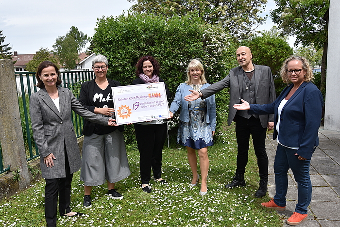 Ein festlicher Moment am 21.Mai 2021 beim Abschlus des Projekts mit Schulqualitätsmanagerin Elke Wimmer, Ilka Wiegrefe - Team Präsent, Römerland Carnuntum Obfrau Daniela Koller, Bildungsstadträtin Lisa Miletich, Projektleiter Franz Babka-Nowak, Römerland Carnuntum Geschäftsführerin Gabriele Preisinger.