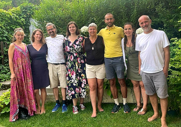 auf unser kompetentes, lebensfrohes und stabiles Team von Klassenworkshop Referent:innen! Hier bei unserem Sommerfest im Juni 2024. Von links nach rechts: Nathalie Seidel, Kathrin Andrusko, Christian Edbauer, Jutta Kubalewsky, Ilka Wiegrefe, Armin Mohebbi, Hannah Schrems und Viktor Bauernfeind